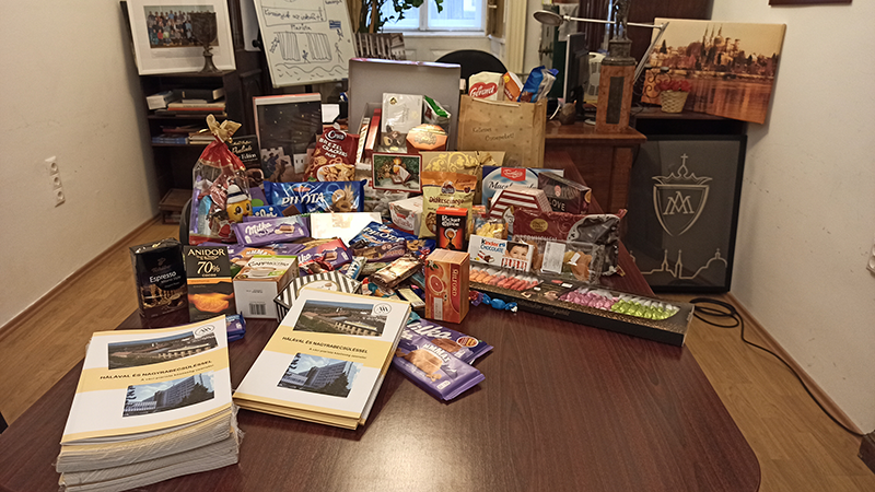 A váci Piarista Gimnázium és Kollégium közössége, amelybe beletartoznak a diákok, a tanárok, a piarista szerzetesek, a szülők, üzeneteiből összeállítottak egy képekkel színesített igényes kiadványt a városunkban működő Jávorszky Ödön Kórház dolgozóinak. December 16-án Kalász Ákos igazgató úr személyesen vitte el a kiadványokat, valamint az összegyűjtött „ehető” ajándékokkal teli csomagokat – Wettstein József házfőnök atya, Szászvárosi Balázs hatodik osztályos tanuló és Kőhegyi Bernadett, mint a szülők képviselője kíséretében. A kiadványból a kórház minden osztályának juttattak, valamint külön gondoltak a váci mentőállomás dolgozóira is.
