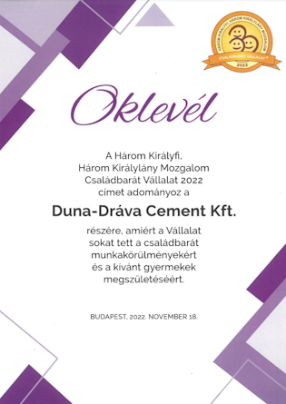 A Duna-Dráva Cement Kft. (DDC) mindig is kiemelt figyelmet fordított dolgozóira. Arra, hogy a munkatársak szívesen dolgozzanak a cégnél, megőrizzék testi és lelki egészségüket és a DDC-re, mint családbarát munkahelyre tekintsenek. Az építőanyag-ipari vállalat családbarát törekvéseit ismét szakmai díjjal ismerték el – olvasható közleményükben.